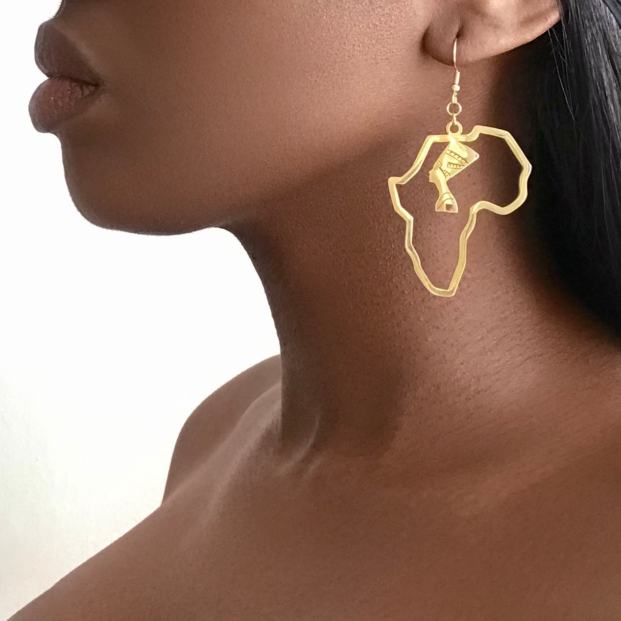 Nefertiti Africa Map Gold Plated Dangle Drop Earrings